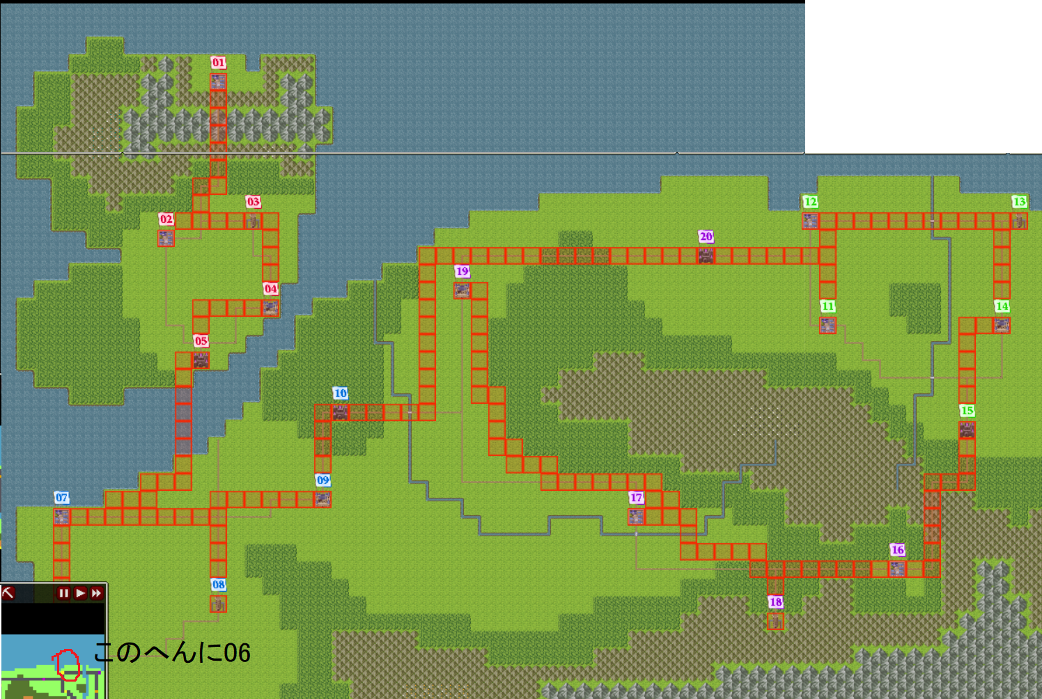 町(括弧は人口):01:ピート・コッチ(7) 02:マチェスト(9) 04:ナイフストン(14) 06:ボスケ(5) 07:マントゥール(6) 09:ラピッド(15) 11:ポロツァン(3) 12:ランツェヒ(5) 14:タルパワ(8) 16:ヴィンター(10) 17:ミュートス(14) 19:パンタルグ(15)