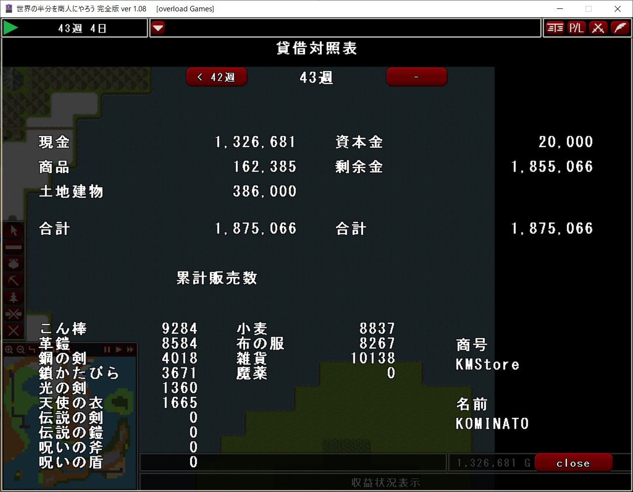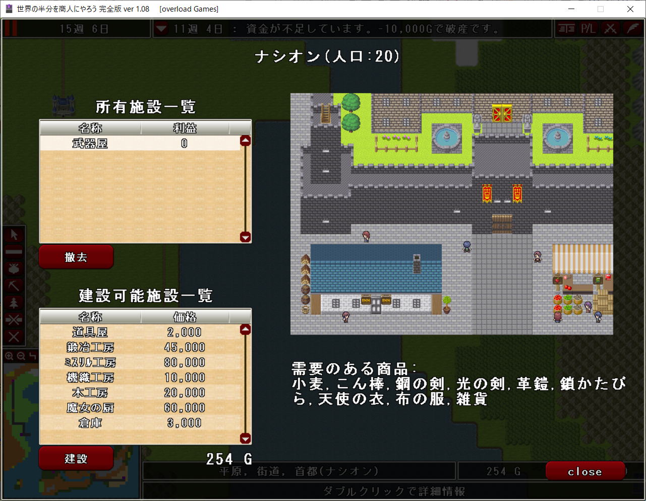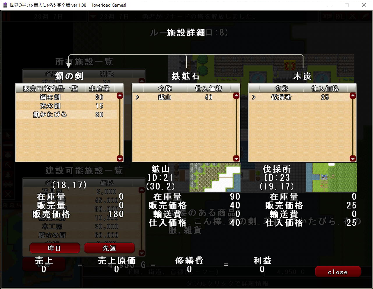 15週6日、グーテ近郊に伐採所を設置し、伐採所→木工場→こん棒のサプライチェーンを確立。ナシオンの町に武器屋を建設。こん棒の販売を開始。